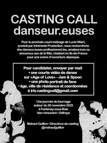Pour le prochain court-métrage de Lucie Wiart, produit par Inhérente Production, nous recherchons des danseur.euses professionnel.les, amateur.ices ou des amoureux.ses de la fête, résidant en Ile de France, pour une scène d’ouverture clipesque.