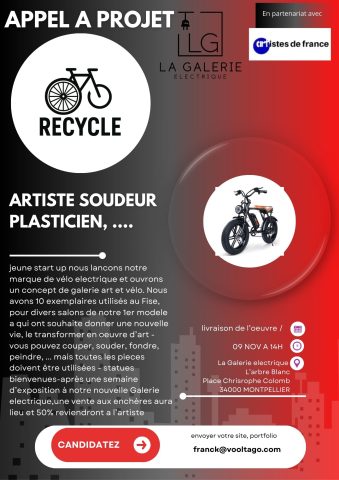 Nous sommes une start up du sud de la france qui avons lancé notre 1er vélo electrique VOOLTAGO qui maintenant est devenue une marque . Nous avons un parc de 8 Vooltago qui ont servi pour kles essais, les expos, le FISE; on souhaite leur donner une nouvelle vie en confiant un cycle /artiste prêt à relver le défit de faire une oeuvre d'art à partir de Vooltago . On peur couper, scier, souder, fondre, bruler, peindre…. une seule règle, toutes les pièces doivent être utilisées . on peut en ajouter quelques unes .