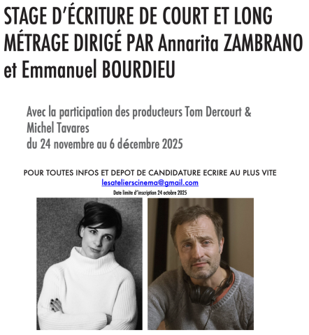 Lors de cet atelier résidence, vous serez accompagné par les réalisateurs et scénaristes Annarita Zambrano et Emmanuel Bourdieu pendant onze jours afin de trouver ensemble l’espace de fiction dans lequel chacune et chacun pourra évoluer pour développer et consolider son projet de scénario de court et long-métrage.