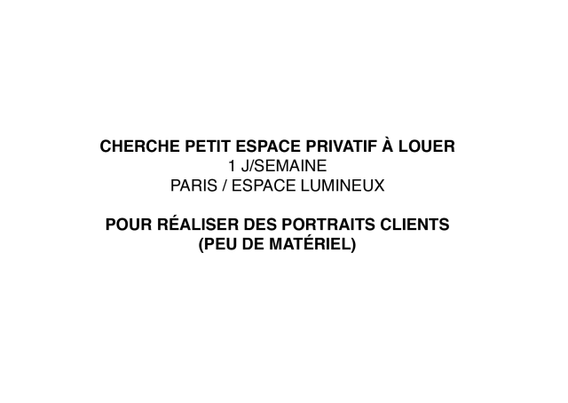 CHERCHE PETIT ESPACE À LOUER / PARIS 14 octobre 2025 Rechercher : Recherche avancée Mettre une annonce Editer votre annonce Les annonces Chercher CHERCHE PETIT ESPACE À LOUER / PARISCliquez pour agrandir l’image.ContactContacter l'auteur Adresse: paris Prix: € 0 Plus d'infoCHERCHE PETIT ESPACE PRIVATIF À LOUER 1 J/SEMAINE PARIS / ESPACE LUMINEUX POUR RÉALISER DES PORTRAITS CLIENTS (PEU DE MATÉRIEL/ PLIABLE FACILEMENT) Cette annonce a été vue 2 fois. SIGNALER L'ANNONCE COMME FRAUDULEUSE