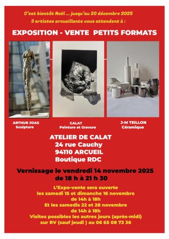 3 artistes arcueillants : Arthur JOAS sculpteur, CALAT Peintre et Graveure et Jean-Marc TEILLON Céramiste
