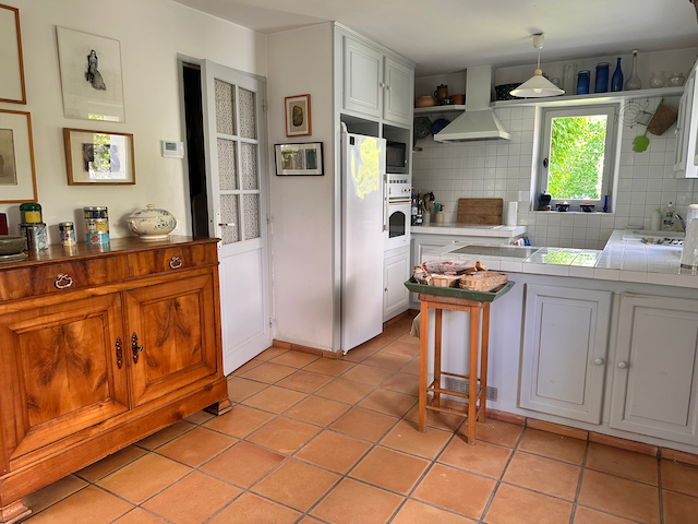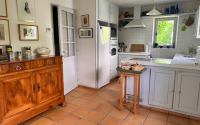 La première habitation a gardé le charme d’antan avec ses poutres, le béton ciré, la pierre et son carrelage. Le rez-de-chaussée est composé actuellement d’un bureau-bibliothèque, d’un salon lumineux avec cheminée, une vaste cuisine avec son espace repas et un petit cellier.
