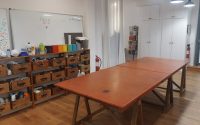 L'espace de travail que nous proposons est dans le bureau du premier étage, avec trois autres designers, et comprend l'accès aux espaces partagés : une grande table rouge au RDC pour les activités manuelles, une salle de réunion au sous-sol pour les réunions, une cuisine, des wc-douches. L’ambiance est très sympa, calme et studieuse. Cela ne convient pas aux activités très salissantes, bruyantes, odorantes. Le prix est de 350€HT (420€TTC).