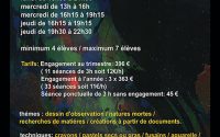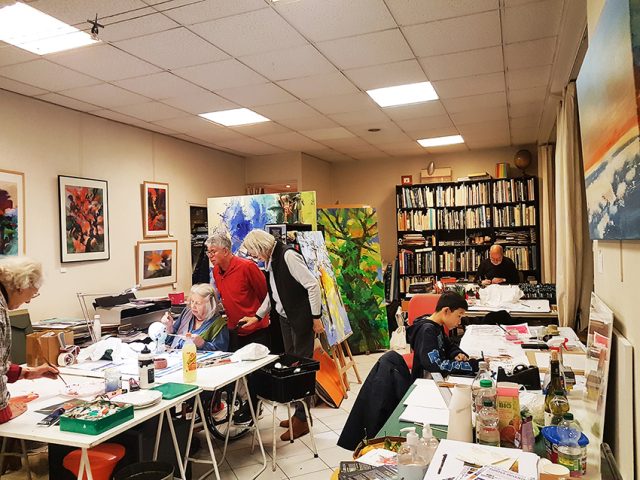 Groupes de 5/6 participants- pas de niveau pré-requis – je propose des sujets mais on peut travailler sur ses propres projets-Je conseille chacun individuellement-Le matériel est fourni (sauf toile): Acrylique-Huile-Pastels secs-Fusains-Crayons de couleurs-Aquarelle-Linogravure- Monotype-Photoshop- Démonstrations -Je scanne les oeuvres et vous envoie le fichier.