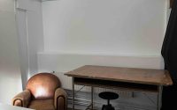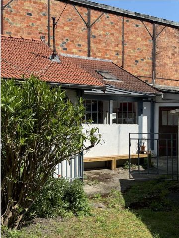 Salle commune avec plusieurs établis pour découpes et pratiques manuelles, un espace de stockage, une cuisine équipée et un grand jardin. L’atelier comporte également un laboratoire argentique noir et blanc.