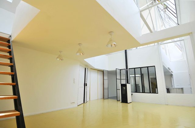 A 3 kms de la porte d'Ivry, 5 mn à pied du RER C (Vitry) et 15 mn du métro (Mairie d'Ivry), dans une rue calme pleine de jardins, nous louons un atelier d'artiste de 140/145 m2 répartis sur deux niveaux.