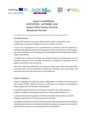 L’Espace d’Arts Visuels est un espace culturel de 60 m² dédié aux expositions d’art contemporain et situé dans le bâtiment pluridisciplinaire du Cairn à Val d’Arc, en Savoie.