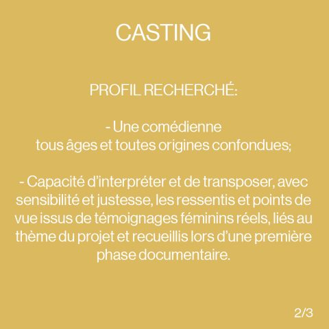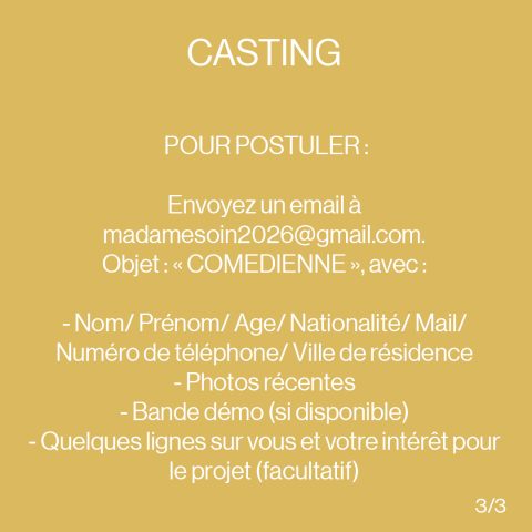 *POSTULER*: Envoyez un email à madamesoin2026@gmail.com. Objet : « COMEDIENNE », avec : (voir slide 3 des visuels de l'annonce pour les élements demandés)