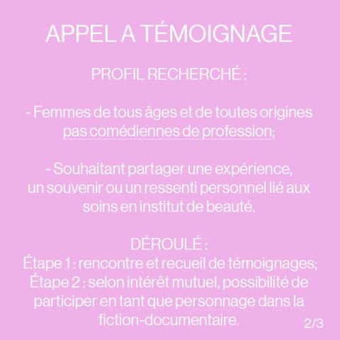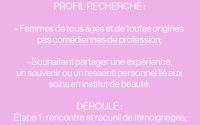 Artiste-réalisatrice, pour une création indépendante de Fiction-documentaire, « Soin esthétique – du corps au cœur », est à la recherche de: