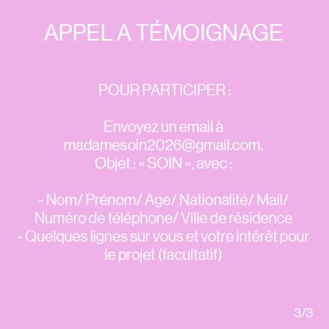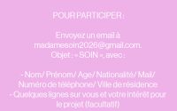 *PARTICIPER*: Envoyez un email à madamesoin2026@gmail.com. Objet : « SOIN », avec : (voir slide 3 des visuels de l'annonce pour les élements demandés)