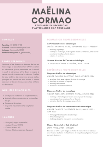 Je serai ravi de collaborer avec vous et d’apprendre la vie de céramiste au cours de cette alternance au sein de votre atelier.