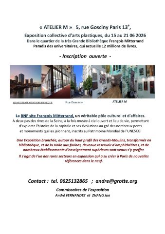 Appel à candidature pour la Grande Exposition collective d’arts plastiques que nous organisons du 15 au 21 JUIN 2026 à l’ATELIER M 5, rue Goscinny Paris 13ème