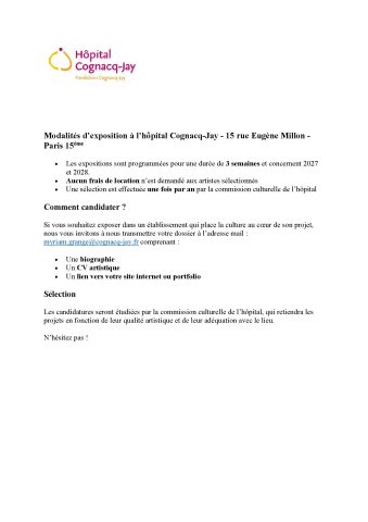 Dans le cadre de sa politique d’ouverture à la culture et de valorisation de la création artistique, notre hôpital situé à Paris 15ème, lance un appel à candidatures à destination des artistes souhaitant exposer leurs œuvres au sein de son hall principal.